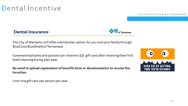 The City of Memphis offers a dental plan option for you and your family through BlueCross BlueShield of Tennessee. The chart below is an overview of the dental plan offered. Please visit https://BCBST.com or call 888-796-0609 for a list of network dental providers and complete plan details.